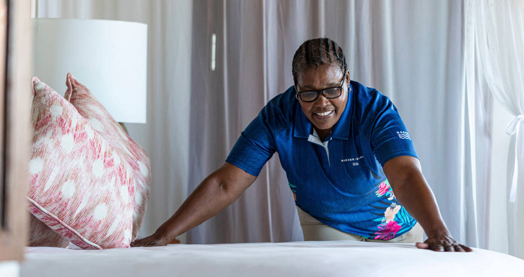 Part of our commitment to sustainability is the introduction of a brand-new uniform for the Necker Island team made entirely from reclaimed ocean waste and recycled plastic bottles. The uniform has been specifically designed for the needs of the private island team, in collaboration with eco-friendly clothing specialists Oceanя, who take post-consumer plastic bottle waste and transform it into a wearable fabric made from recycled polyester. We're thrilled that the introduction of the new uniform alone has already prevented nearly 20,000 plastic bottles from going to landfill! In fact, an average Necker Island uniform t-shirt made from the recycled material uses the equivalent of 13 two-litre plastic bottles - using these fabrics helps us to not only keep plastic out of the landfills and oceans, but also to save our natural resources.