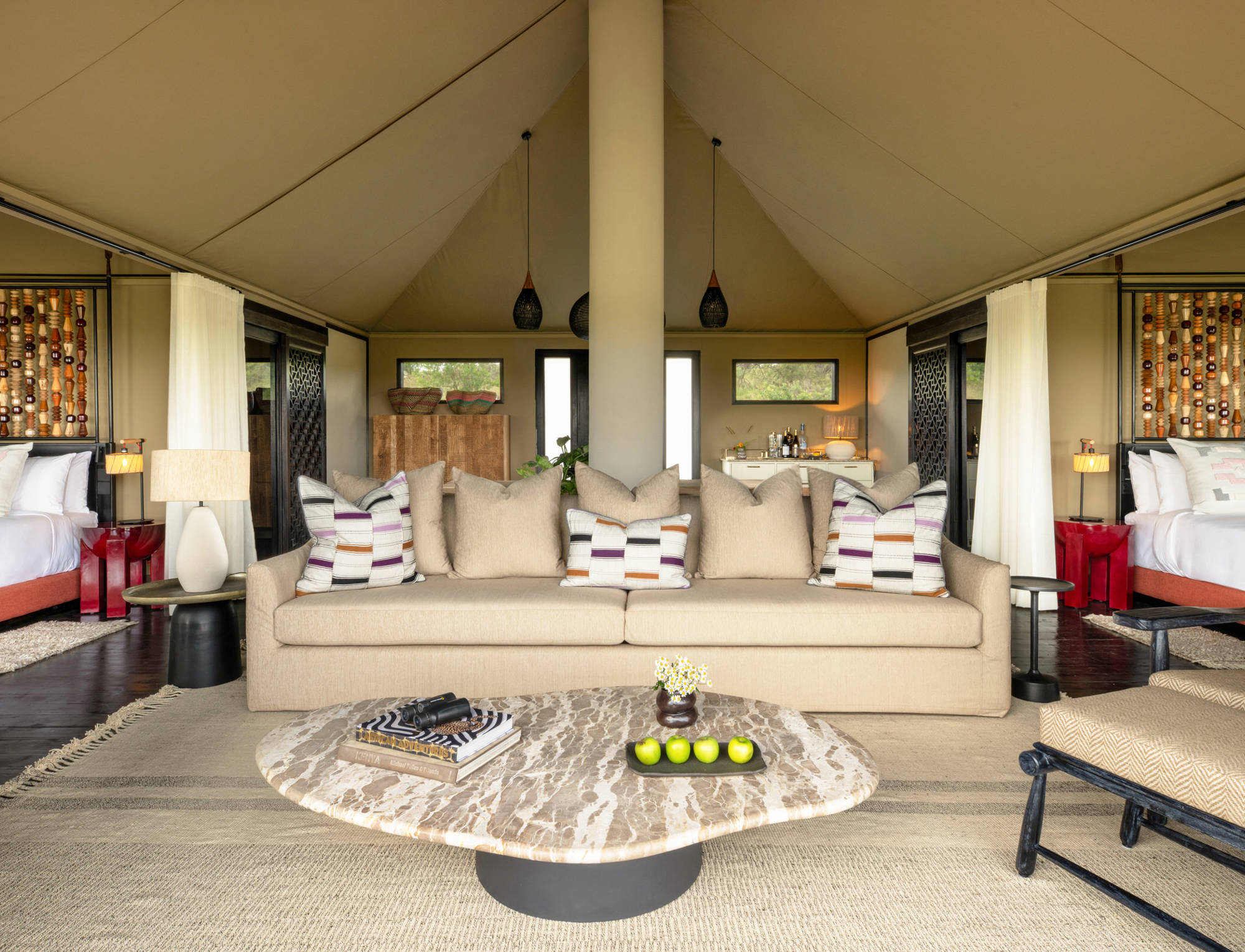 Step into the newly reimagined tents and you'll find a colour palette that whispers the story of the earth: warm taupes, deep browns, and soft ivories echo the dust and bark of the savannah, while vibrant reds and bold blacks pay tribute to the traditional attire of the Maasai warriors. It’s a sophisticated yet grounded palette that feels both luxurious and utterly authentic.
