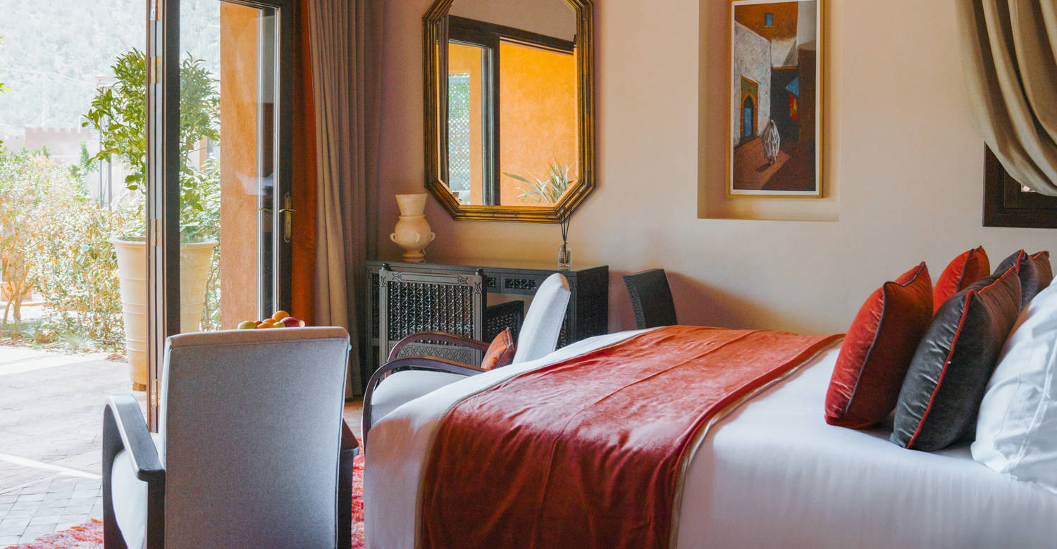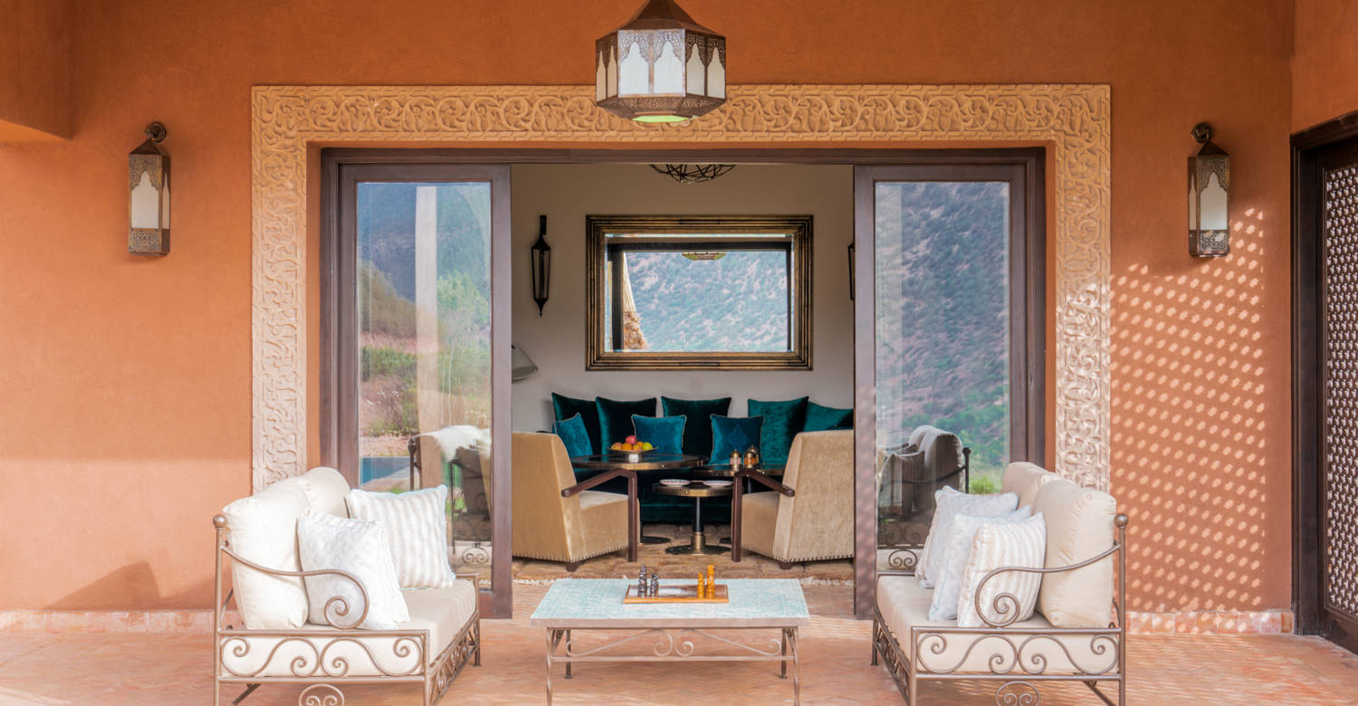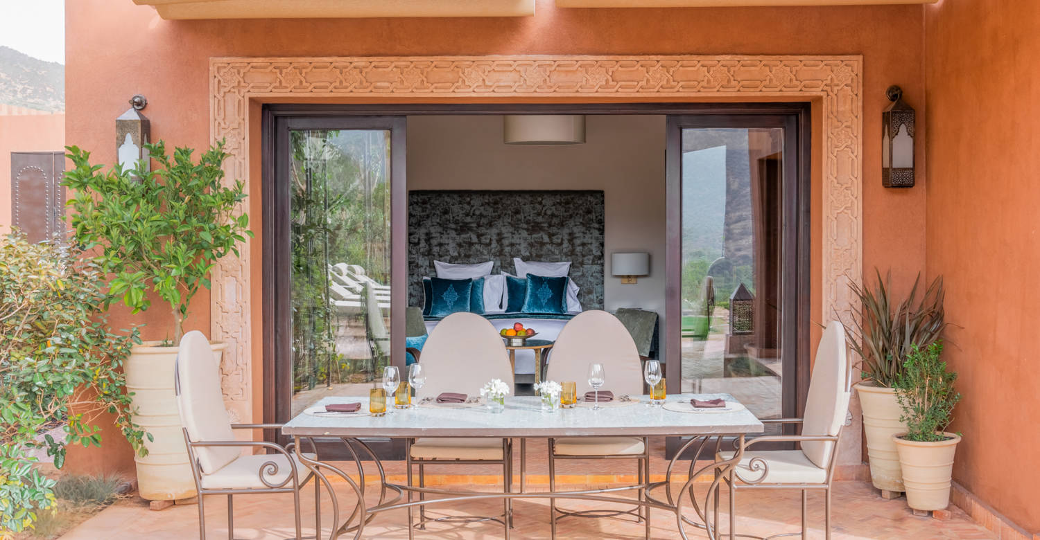 The Riad Pool Suites are the ultimate private escape, each featuring a king-size bed and en-suite bathroom with a waterfall shower and large bathtub. A separate lounge offers ample space for indoor relaxation, complete with a charming fireplace that enhances the cosy atmosphere. The lounge opens to a beautiful garden and terrace, home to a private heated pool and sun loungers perfectly positioned to admire those mountain vistas.