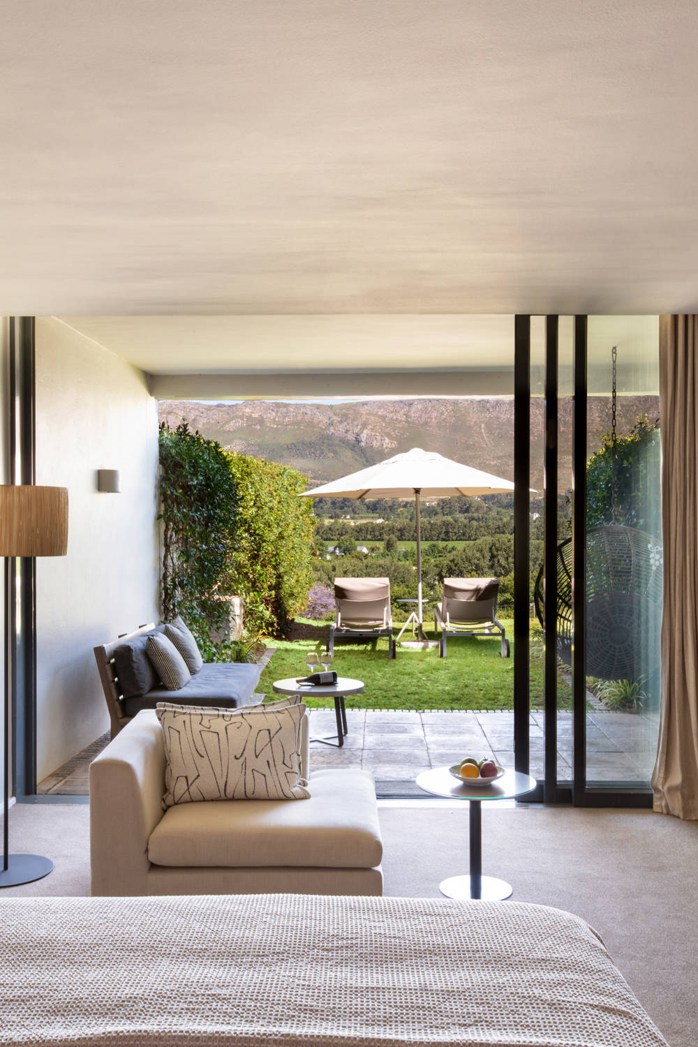 The pinnacle of space and comfort, the Cap Classique Pool Suite offers a private sanctuary with uninterrupted views of the vineyards, Franschhoek mountain range, and gardens, and your very own heated plunge pool.