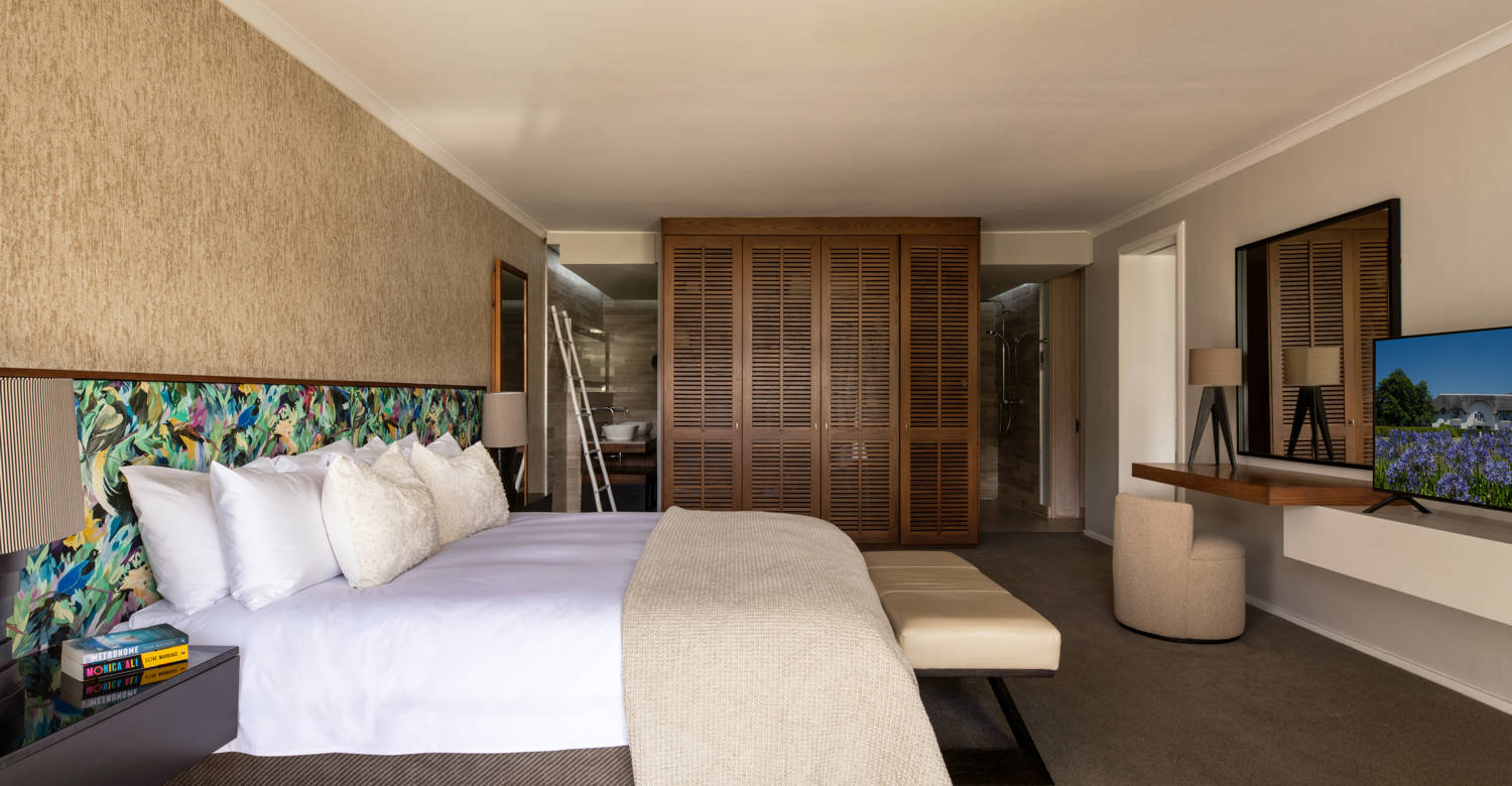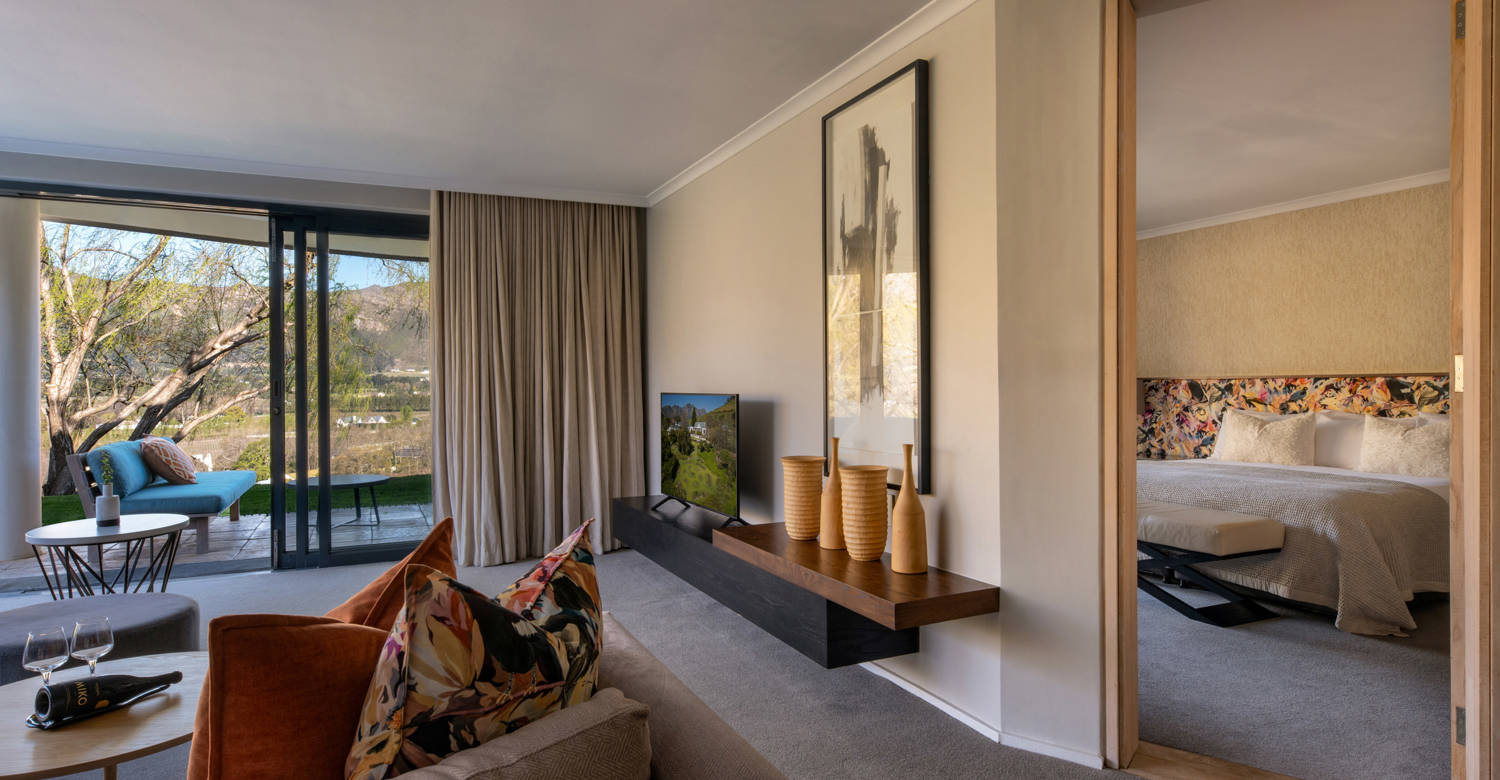 Nestled in the Vineyard Wing, the Cabernet Room with Private Terrace offers a private escape with uninterrupted views of the vineyards, Franschhoek mountain range, and gardens.
