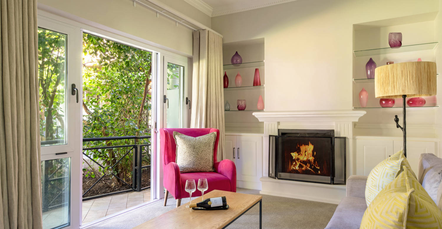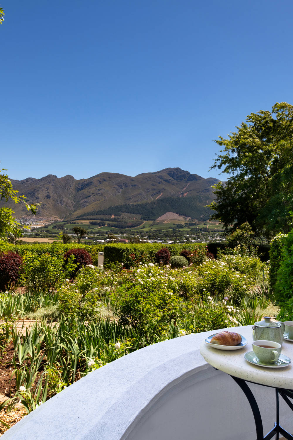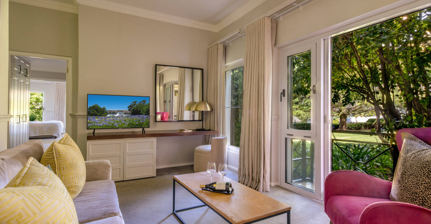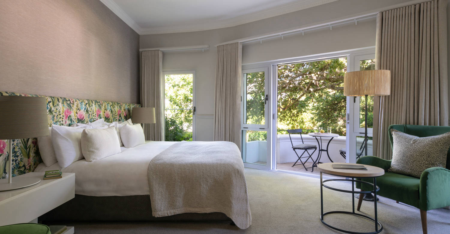 Nestled in the Vineyard Wing, the Cabernet Room with Private Terrace offers a private escape with uninterrupted views of the vineyards, Franschhoek mountain range, and gardens.