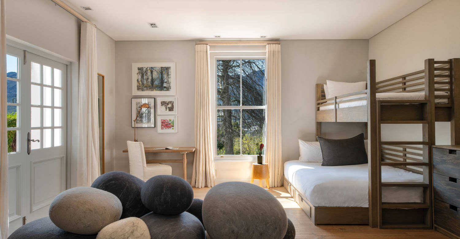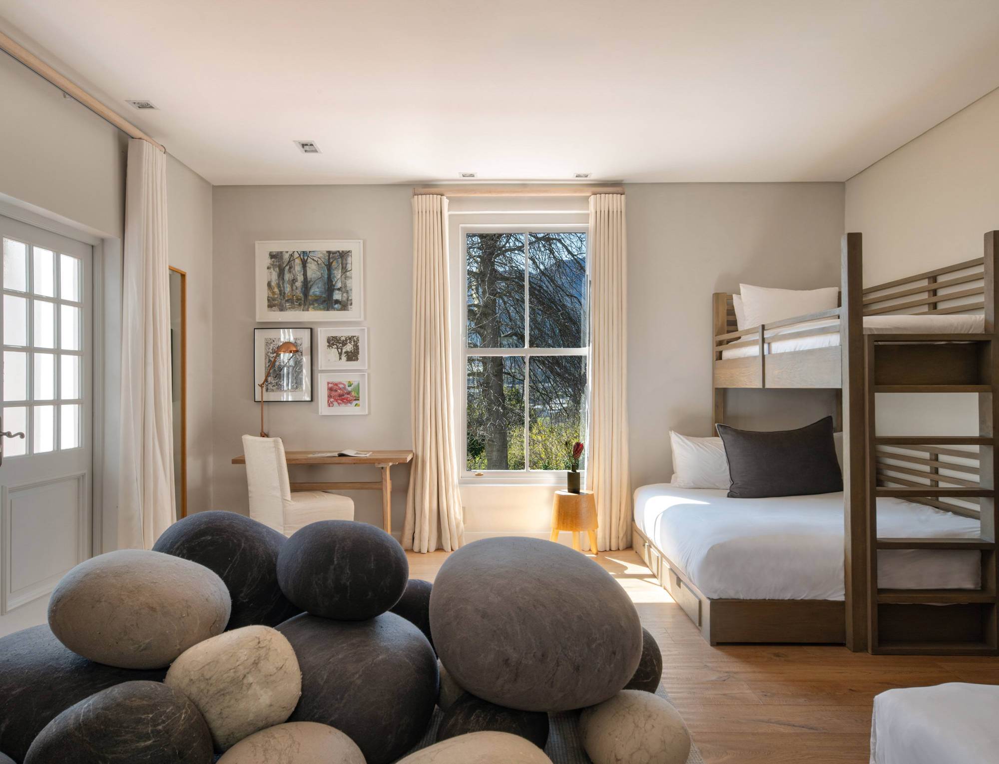 The Bunkroom is our fun and inclusive space for children to enjoy day and night. This generous room has two double and two single beds set out over playful bunks. There’s also a large open floor area with plenty of room to play, relax and hang out. Home comforts include soft linen, comfy seating and a double en-suite bathroom, with French doors leading out onto the front of the property.