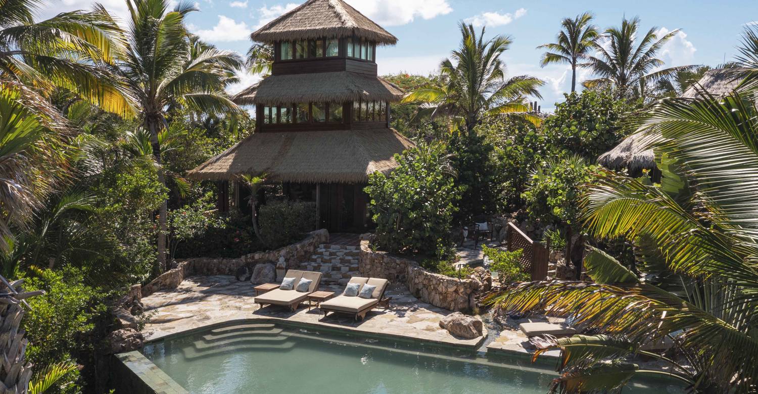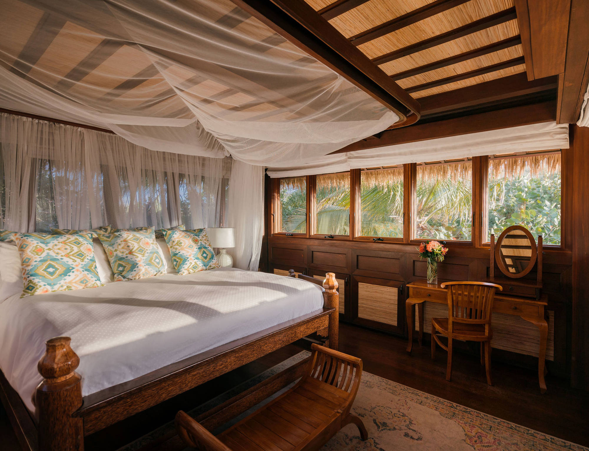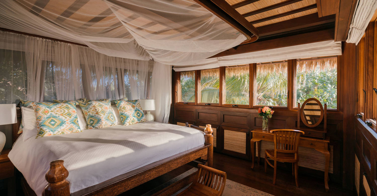 This two-level house is decorated in traditional Balinese style, made from beautiful natural materials with wooden pillars and furniture. Spread over 1,360 ft², the ground floor has an airy lounge with a wraparound terrace and French doors that lead directly out to the pool area. The top floor sleeps two in a king-size bed with an en-suite bathroom. And the best part? There are windows on all sides to take advantage of the incredible views of the ocean.