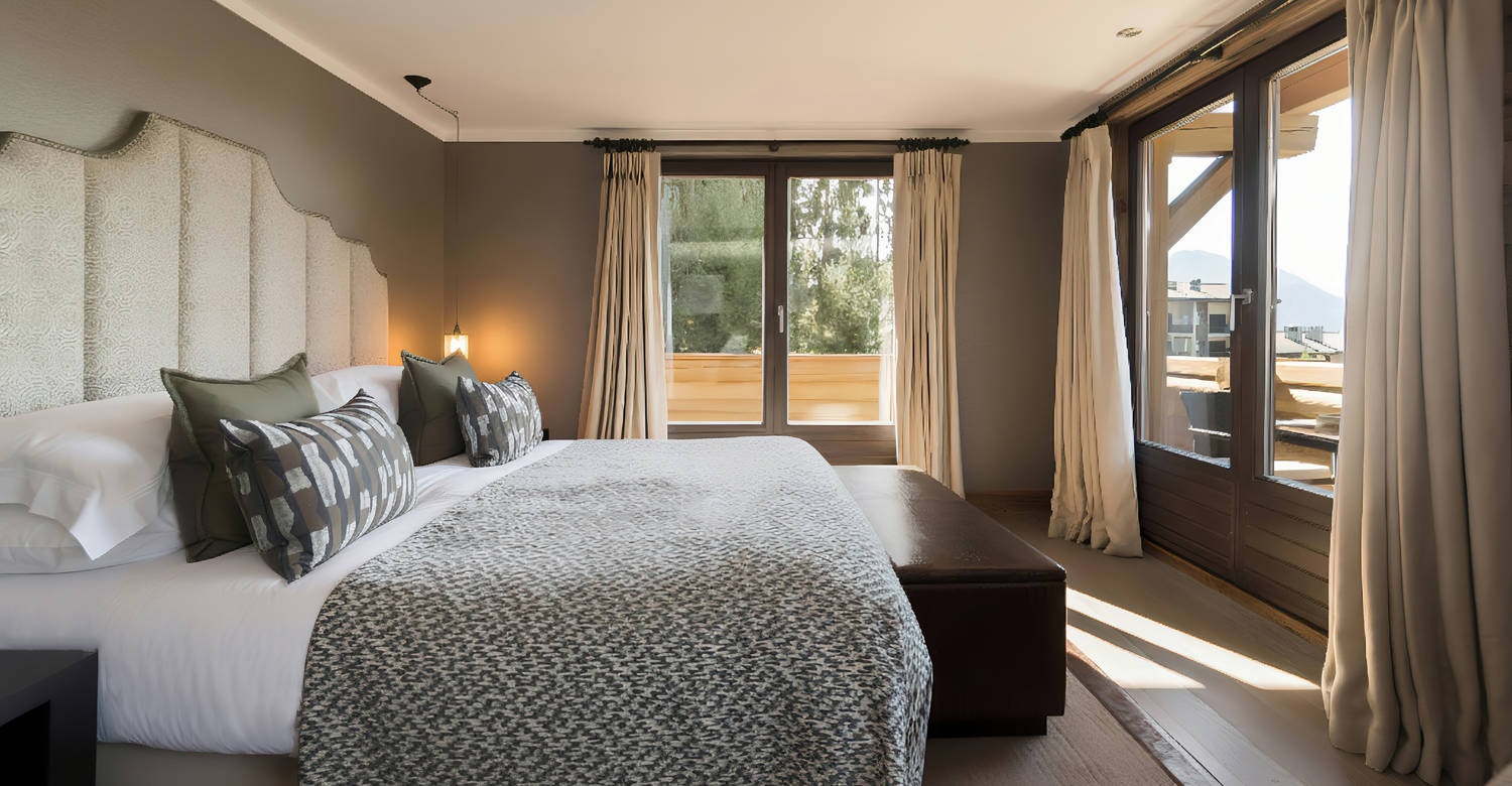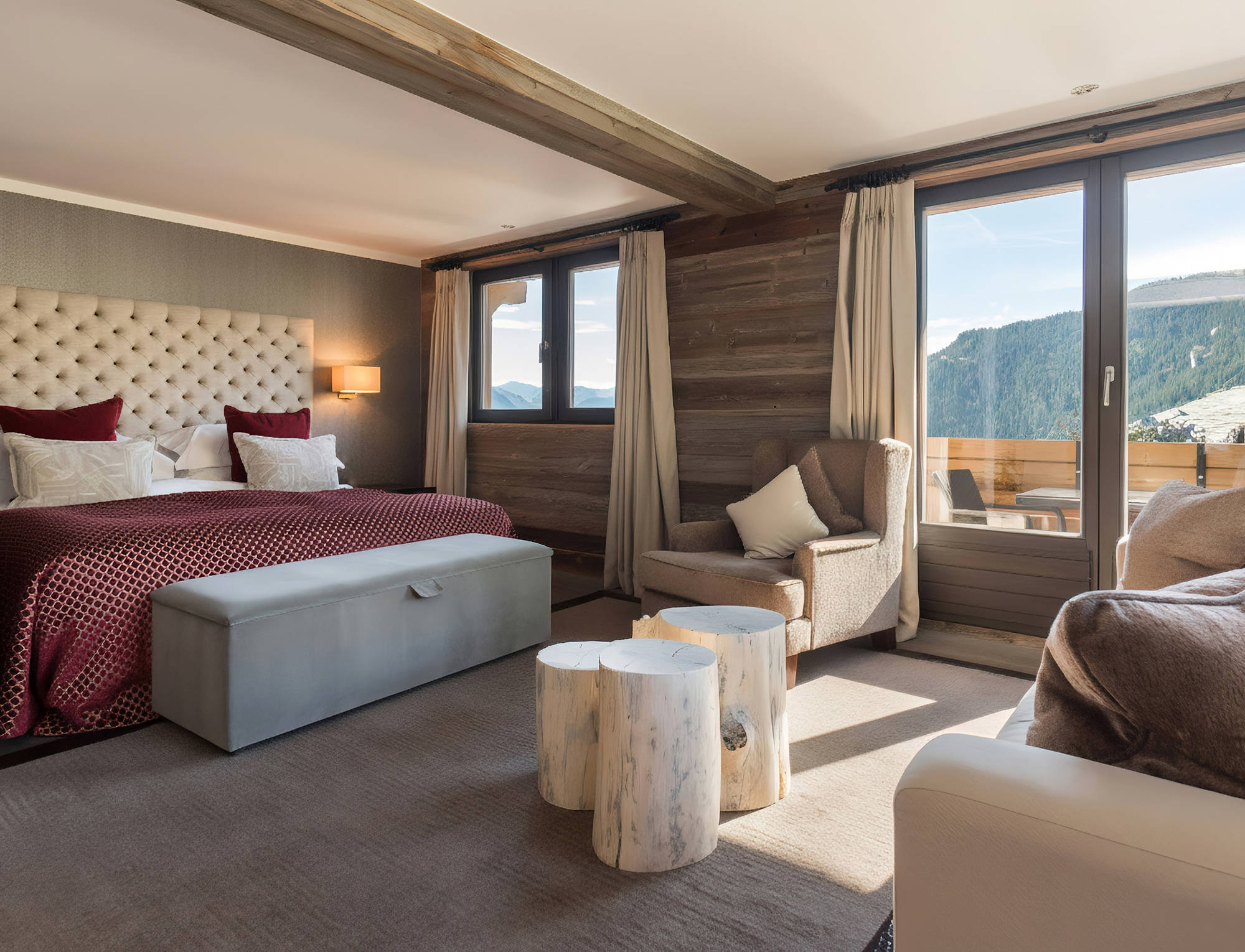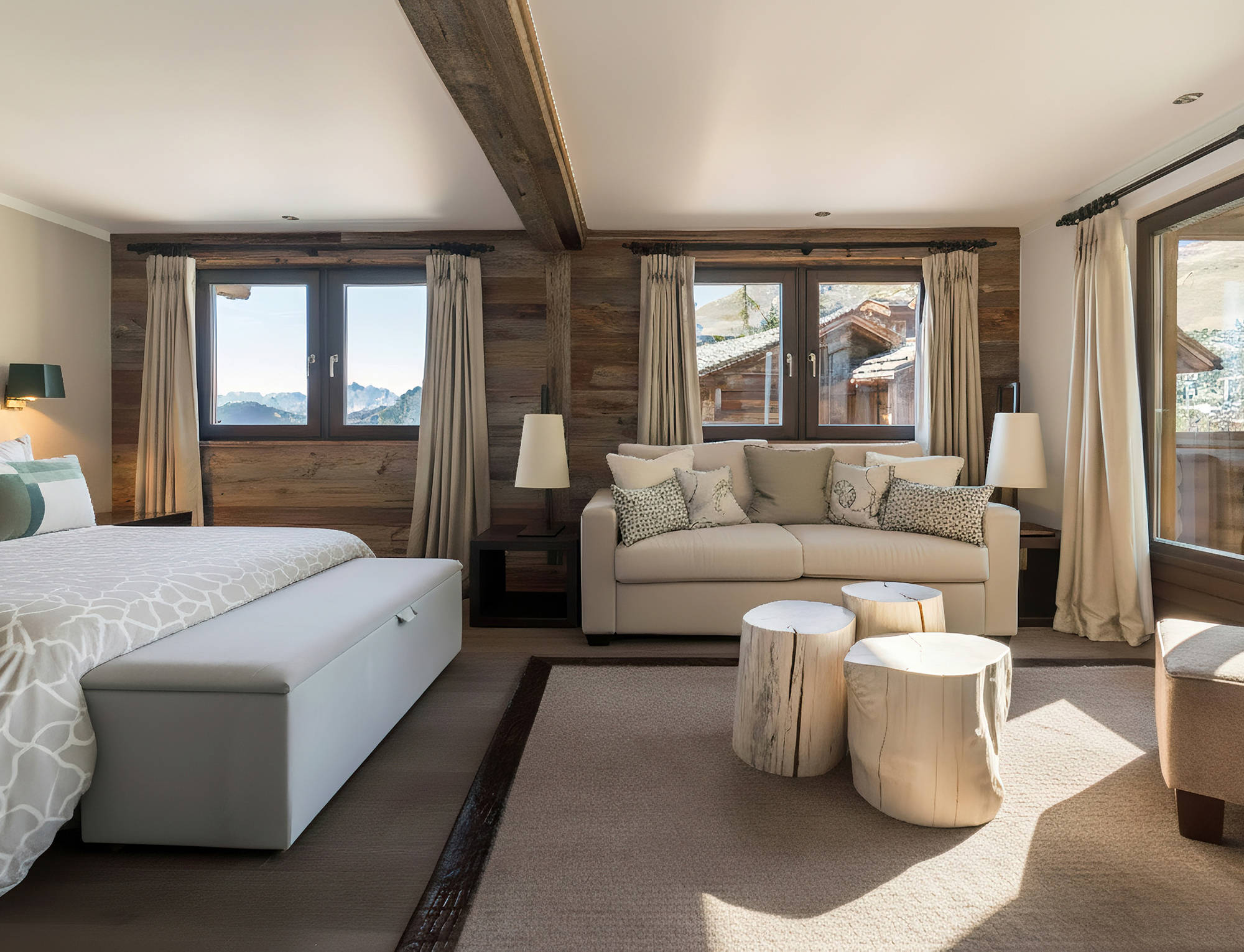 With traditional wooden beams, a decadent central fireplace and balconies commanding awe-inspiring mountain views, our two enormous Master Suites are the perfect place to unwind after an action-packed day in the Swiss Alps.