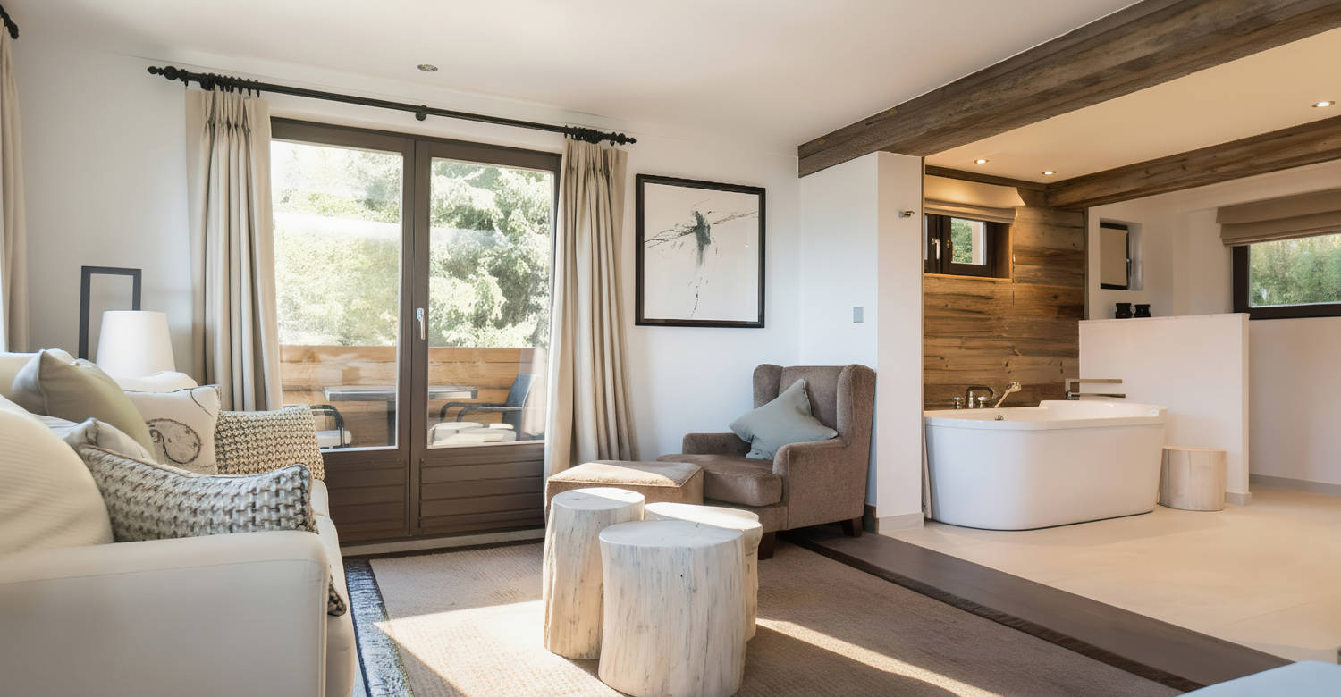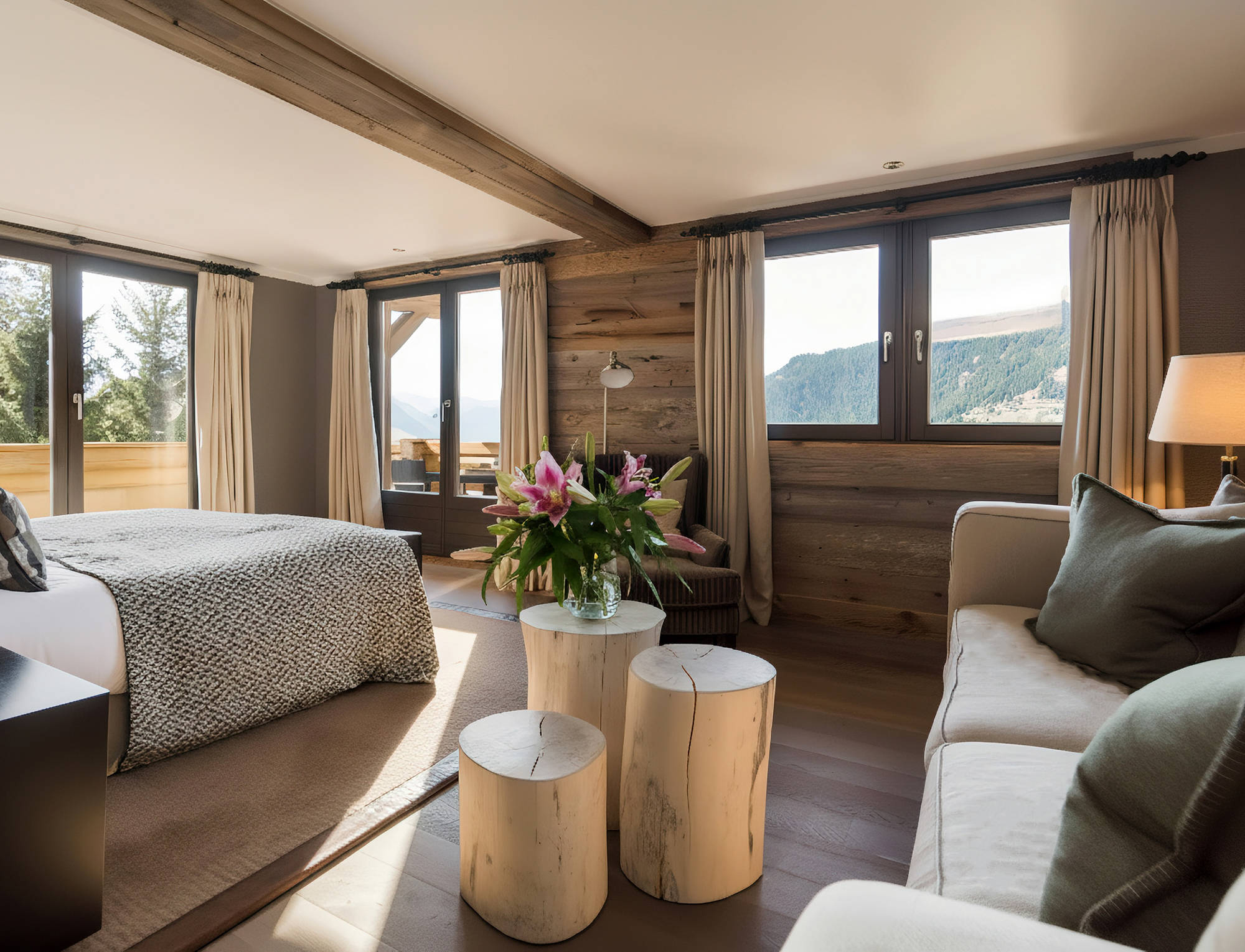 Our Lodge Suites are perfect if you’re searching for a little more room to spread out, with a generous 28 to 33 square metres in which to get comfortable. Each has a calming sleeping area, luxurious en-suite bathroom with separate shower and bathtub, and plenty of richly upholstered furniture to snuggle down on with a blanket and get comfortable. In winter, sink into the relaxing bathtub for a soak. In summer, grab a refreshing drink and sit out on your own private balcony, taking in the views and enjoying the alpine sun.
