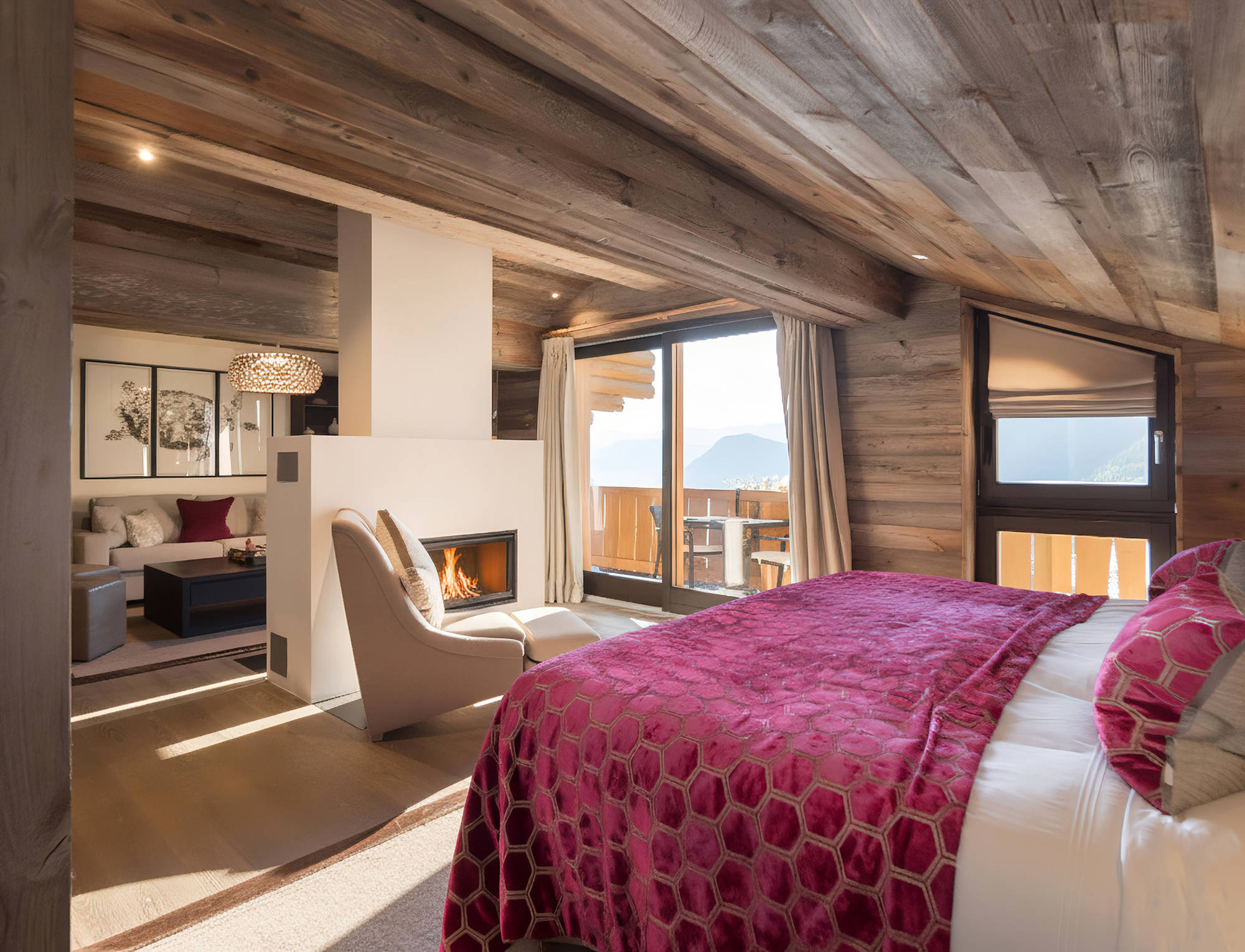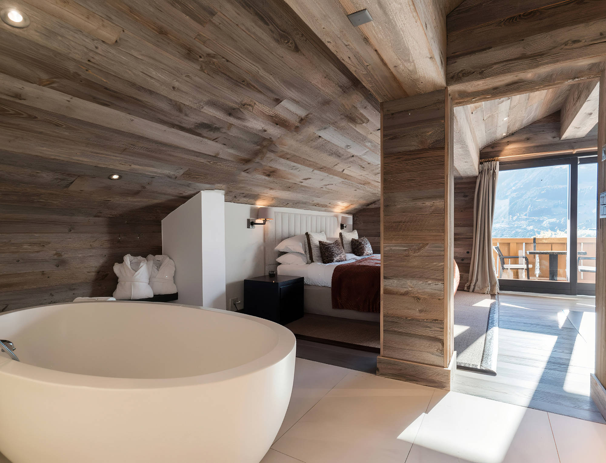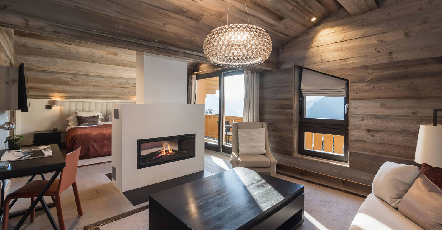 With traditional wooden beams, a decadent central fireplace and balconies commanding awe-inspiring mountain views, our two enormous Master Suites are the perfect place to unwind after an action-packed day in the Swiss Alps. Run a fragrant bubble bath and enjoy a soak in the tub, curl up on the plush sofa with a good book or simply relax in front of the fire. This is a calming, comfortable space where you can lose track of time. Both Master Suites are connected by a secret doorway hidden behind a bookcase – see if you can find it!