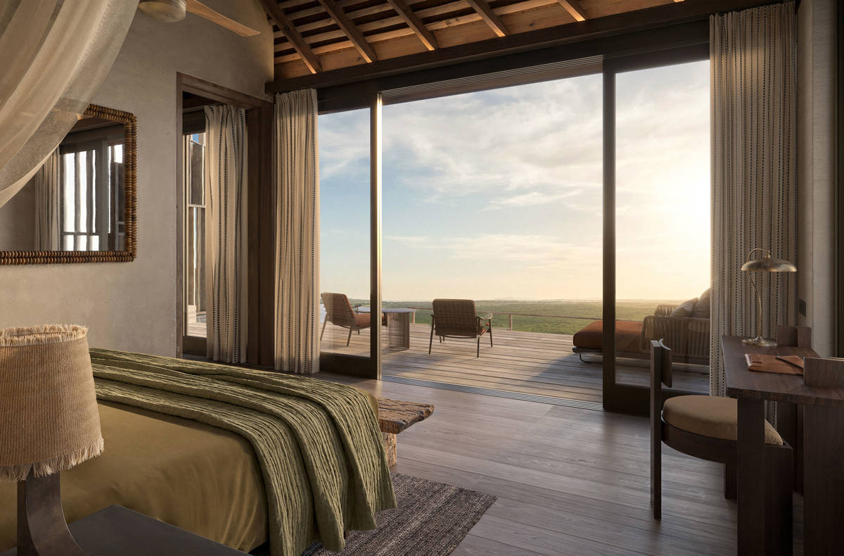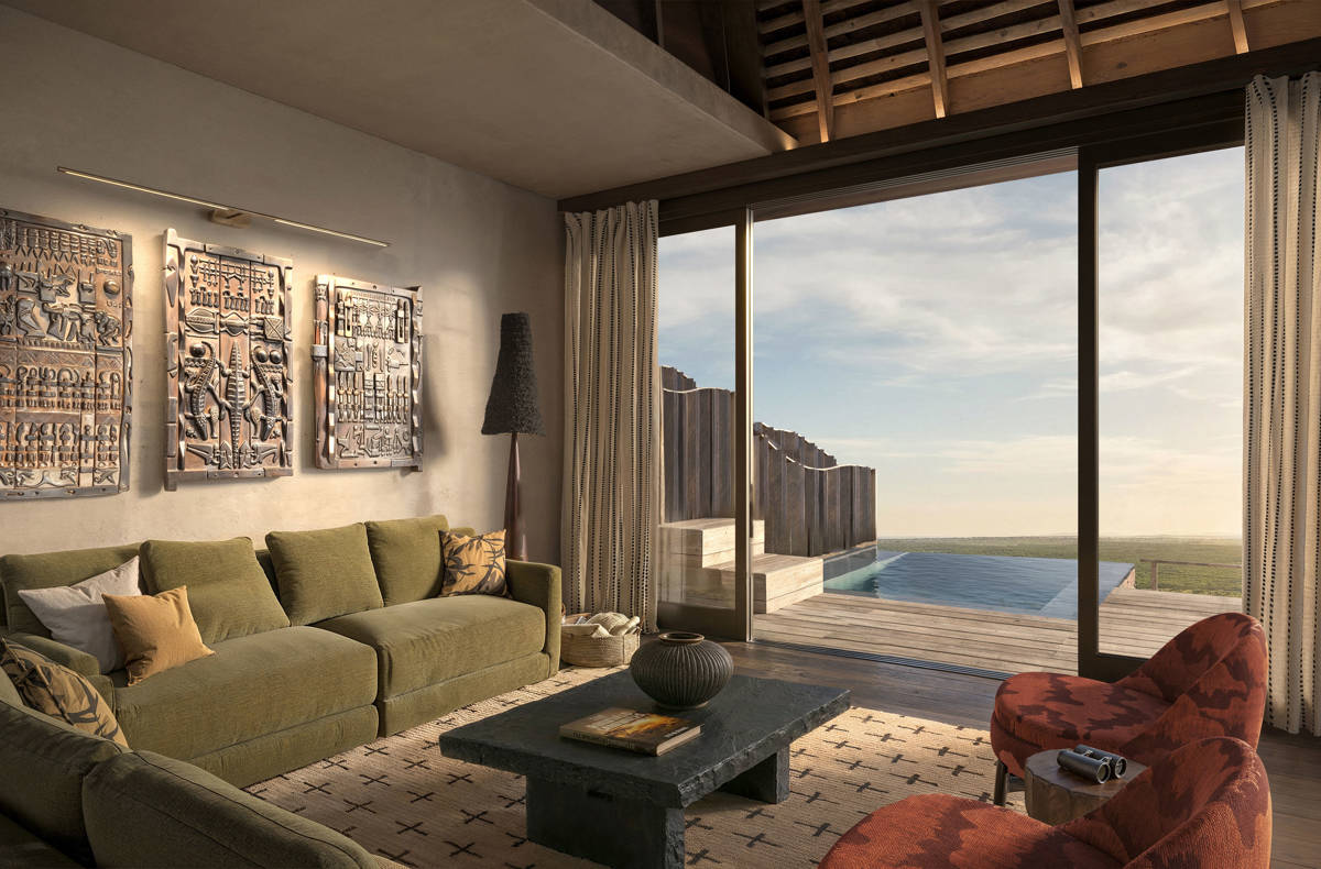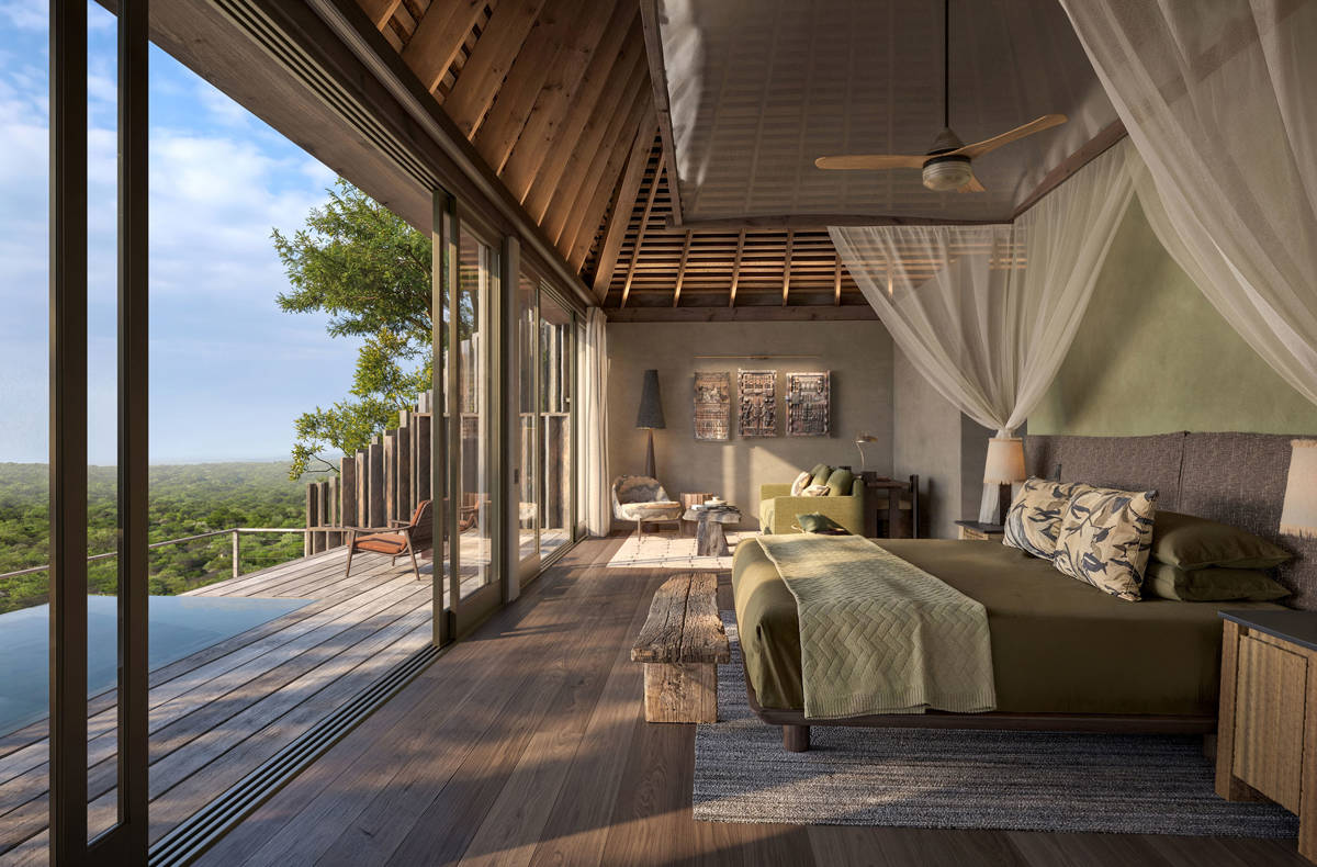 Set atop the koppie with uninterrupted bush views, the Rock Suites combine soaring vaulted ceilings with floor-to-ceiling retractable glass doors, bathing each space in soft, golden African light.