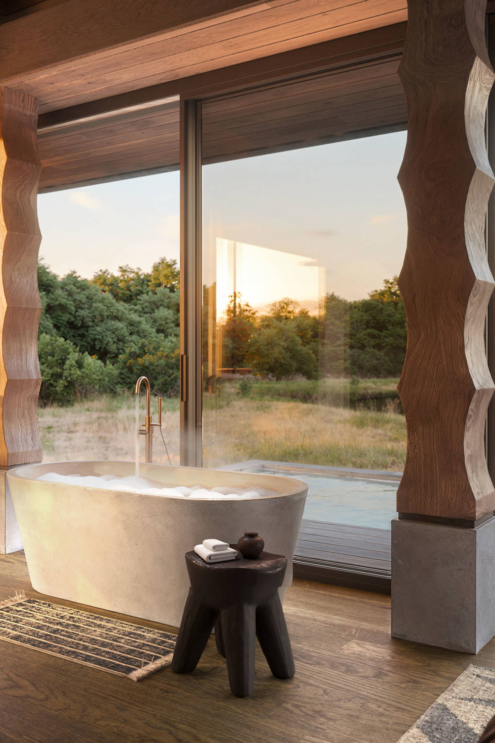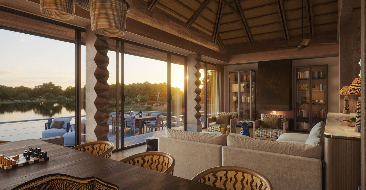 Elevated beside a hippo-filled lake, The Hide’s three exclusive treehouse-inspired suites offer intimate wildlife encounters and a deep sense of seclusion. Designed for families or small groups, a separate shared living space features a spacious lounge, indoor and outdoor dining areas, and an expansive deck with a boma firepit, creating a communal haven that balances privacy with togetherness. Each suite includes a private plunge pool, freestanding bathtub, and private deck with serene water views, complemented by interiors enriched with organic textures, cultural craftsmanship, and refined artisanal detail.