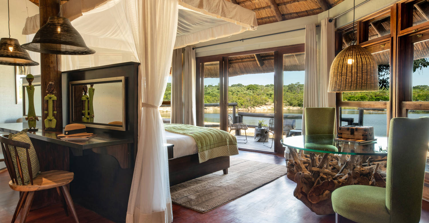 This unique and private suite commands astounding views from its deck, which overlooks the Xikwenga Dam, where hippos and elephants come to bathe. There’s also a large viewing deck adjacent to the bedroom, perfect for breakfasts, lunches and private dinners accommodating 16 people. The Treehouse Suite is approximately a ten-minute walk from the main lodge and is accessible by swing bridges and raised walkways.