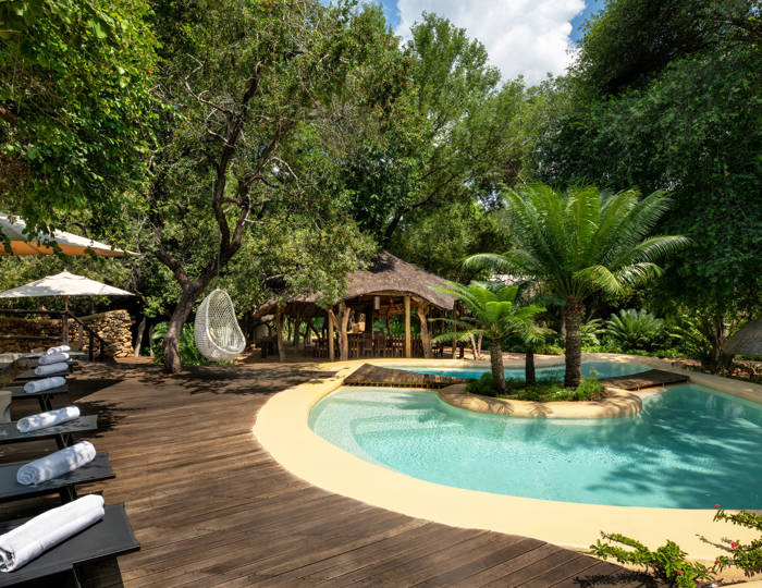 Rock Lodge is perched on top of a koppie (small hill), enjoying panoramic views of the bush below from its eight rooms. The nearby Cliff Lodge offers accommodation across two spacious suites. Built along the banks of a dry riverbed, Safari Lodge offers ten treehouse-style rooms.